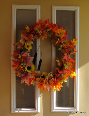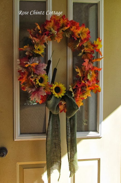 This is last year's wreath with coloured leaves, sunflowers, and cattails.