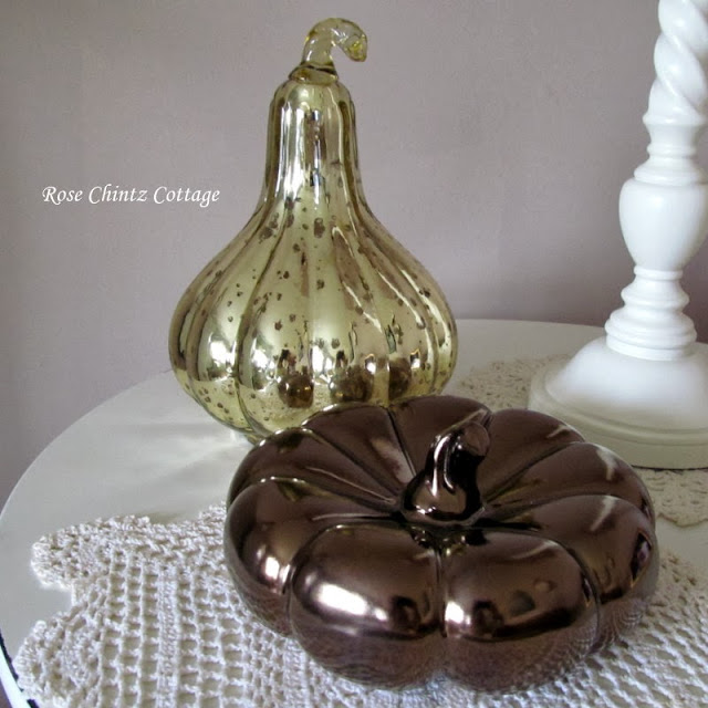 Inside, I have some of my mercury pumpkins out. This little beauty is sitting on a pretty doilie which my niece crocheted for me. The pattern is Pineapple Blossom.