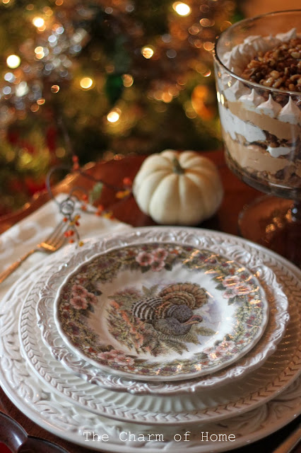 Sherry @ The Charm of Home shared her beautiful Thanksgiving place setting. I just love her layered china and that trifle looks delish!