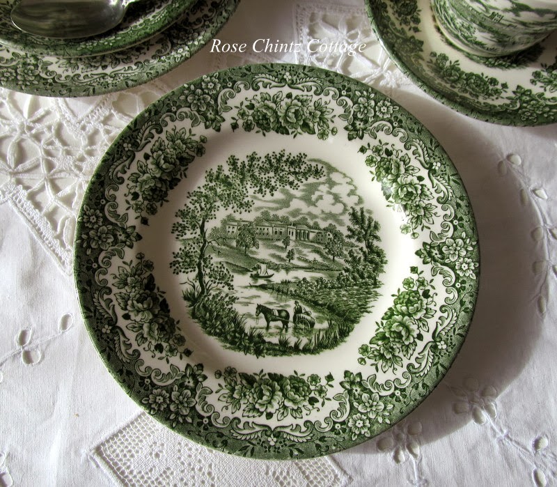 Well, Hubby went back and got me a second set. I just love this rich green transferware! A charming scene is depicted on it and of course it is made in England. Now I have a cup for you and a cup for me.