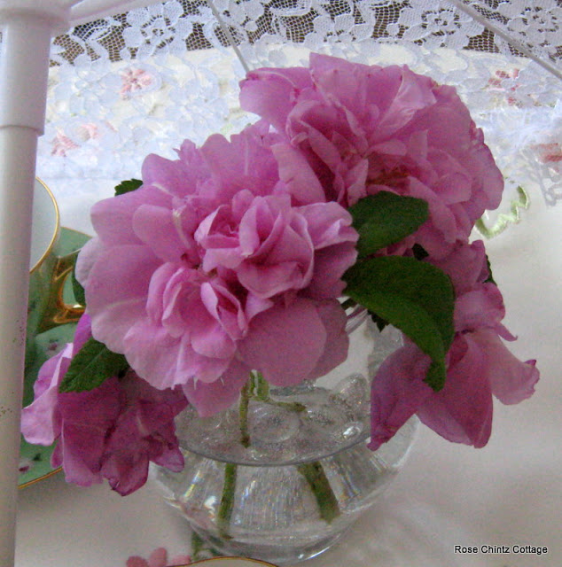 Pink roses grace the tea table because, "After all, the only real roses are pink ones. They are the flowers of love and faith." ~ Anne Shirley of Anne of Green Gables