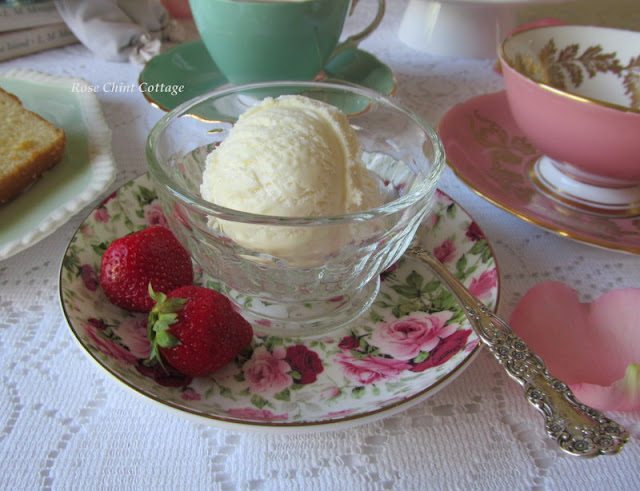 I forget the maker of the little vintage bowl which holds the ice cream. I found it in an antique shop.