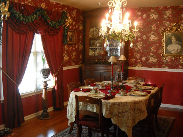 Gina @ Victorian Wanna Be shared her Christmas in the dining room. Isn't this a gorgeous room? Love the wallpaper!