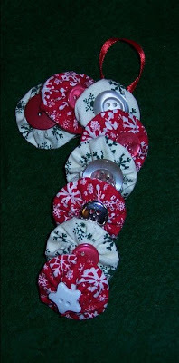 Mrs. T @ Across My Kitchen Table had the most clicks on her post. She shared some wonderful ideas using fabric from her Christmas fabric stash such as this cute yo-yo candy cane. Congratulations Mrs. T!