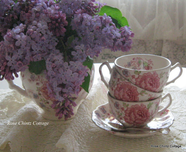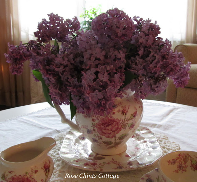 I have pieces of china that look fabulous with lilacs but none look as pretty or so charming as my Johnson Bros. Rose Chintz. Those little lavender blue flowers in the pattern pick up on the colour of the lilacs so nicely. So I hope you will indulge me today. My little lavender turtle is joining us too. He hasn't made an appearance in quite a while.