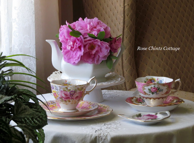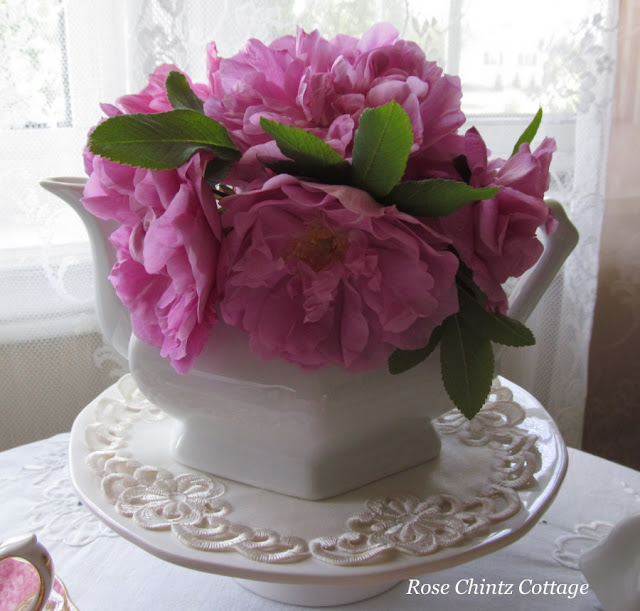 For tea time, I am going with a pink theme today because I have cut some fresh roses from my bushes and they are sitting pretty in a teapot.