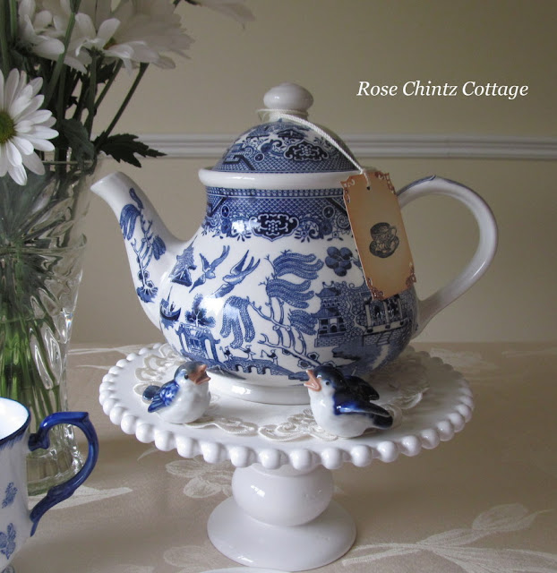 Blue and white china graced by daisies and my Churchill Blue Willow teapot along with a Spode teacup made in England.