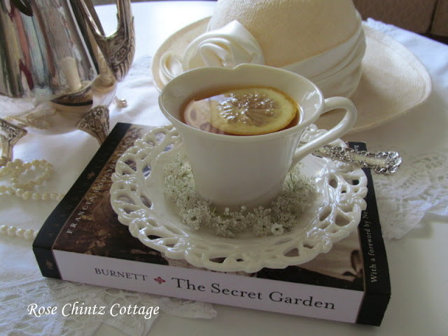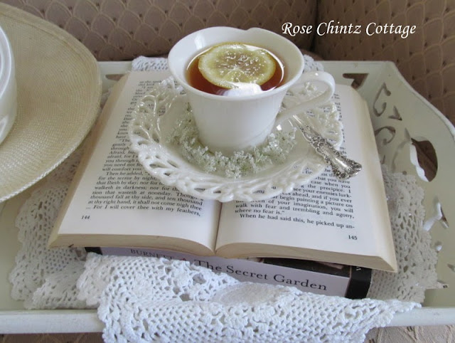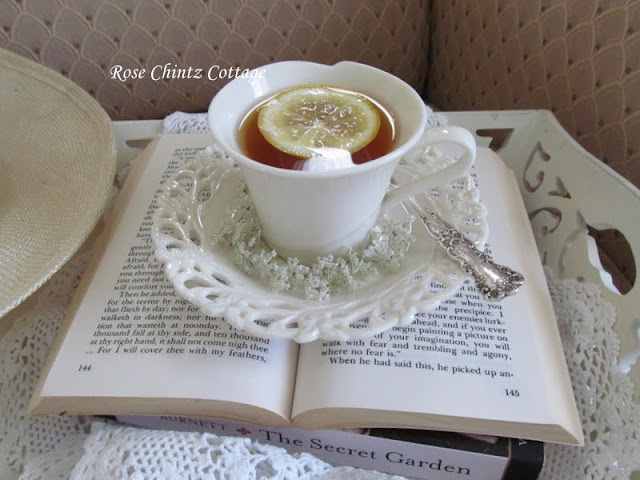 I felt like a quiet tea time today so I am using my creamy white Skye McGhie teacup called Chantilly Lace. I added a few sprigs of Queen Anne's Lace which snuggle up to my teacup. This lovely lacy flower/weed is growing profusely all over the Island right now. Bernideen, you would love it!