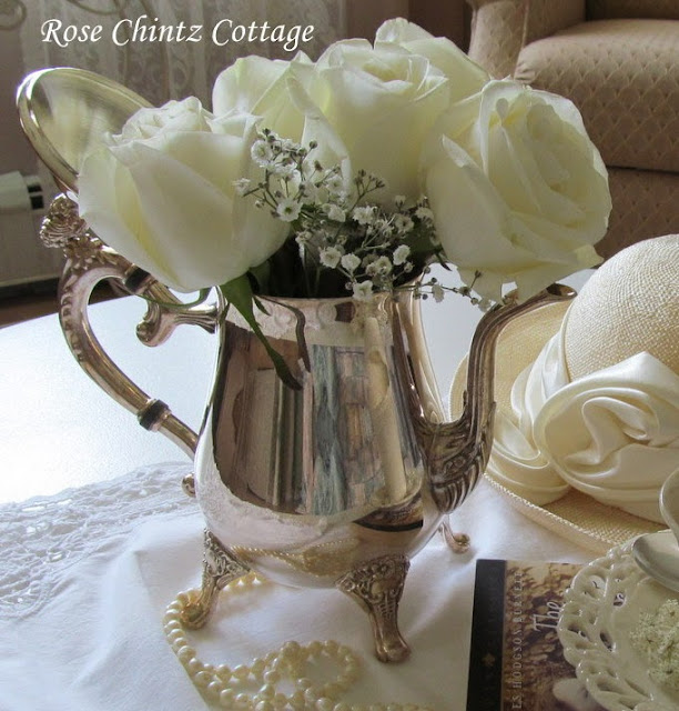 Back to our tea ~ I arranged some creamy white roses in a silver coffee pot which has a bit of a patina on it.