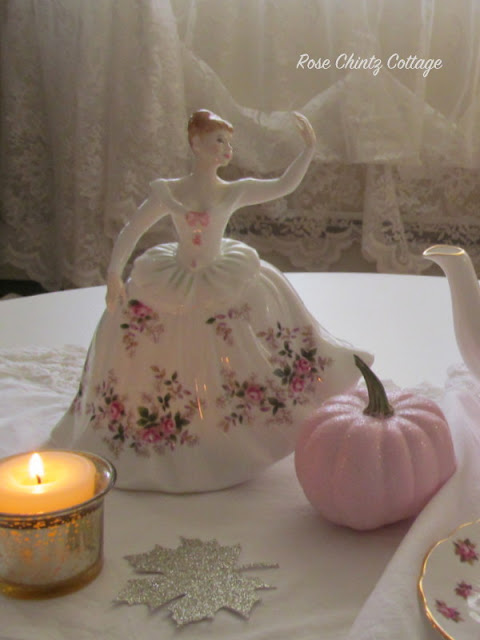 This Royal Dalton figurine reminds me of Cinderella so she is joining us for tea today. As you can see her frock is the Lavender Rose pattern.