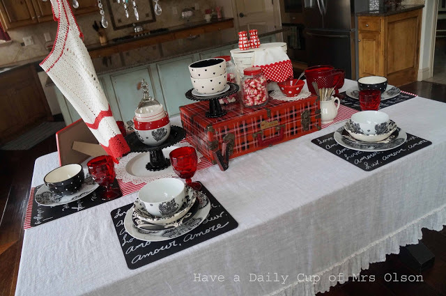 And Jann @ Have a Daily Cup of Mrs. Olsen shared her attractive Valentine picnic tablescape in red, white and black. The folding plaid picnic table was a great find!