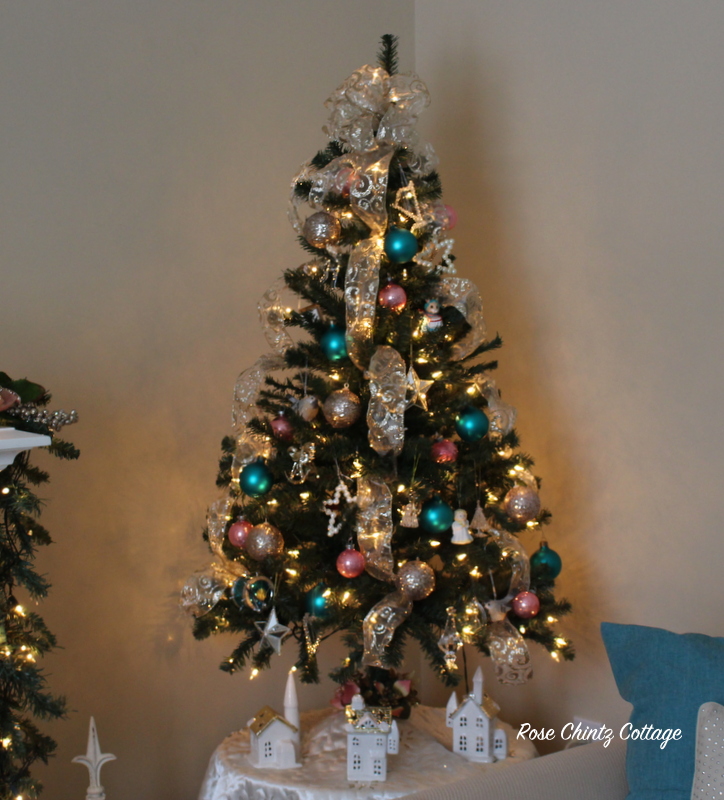 In the living room we have a four foot tree which I have decorated in gold, pink and teal. It too holds lots of Memory ornaments.
